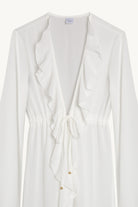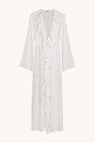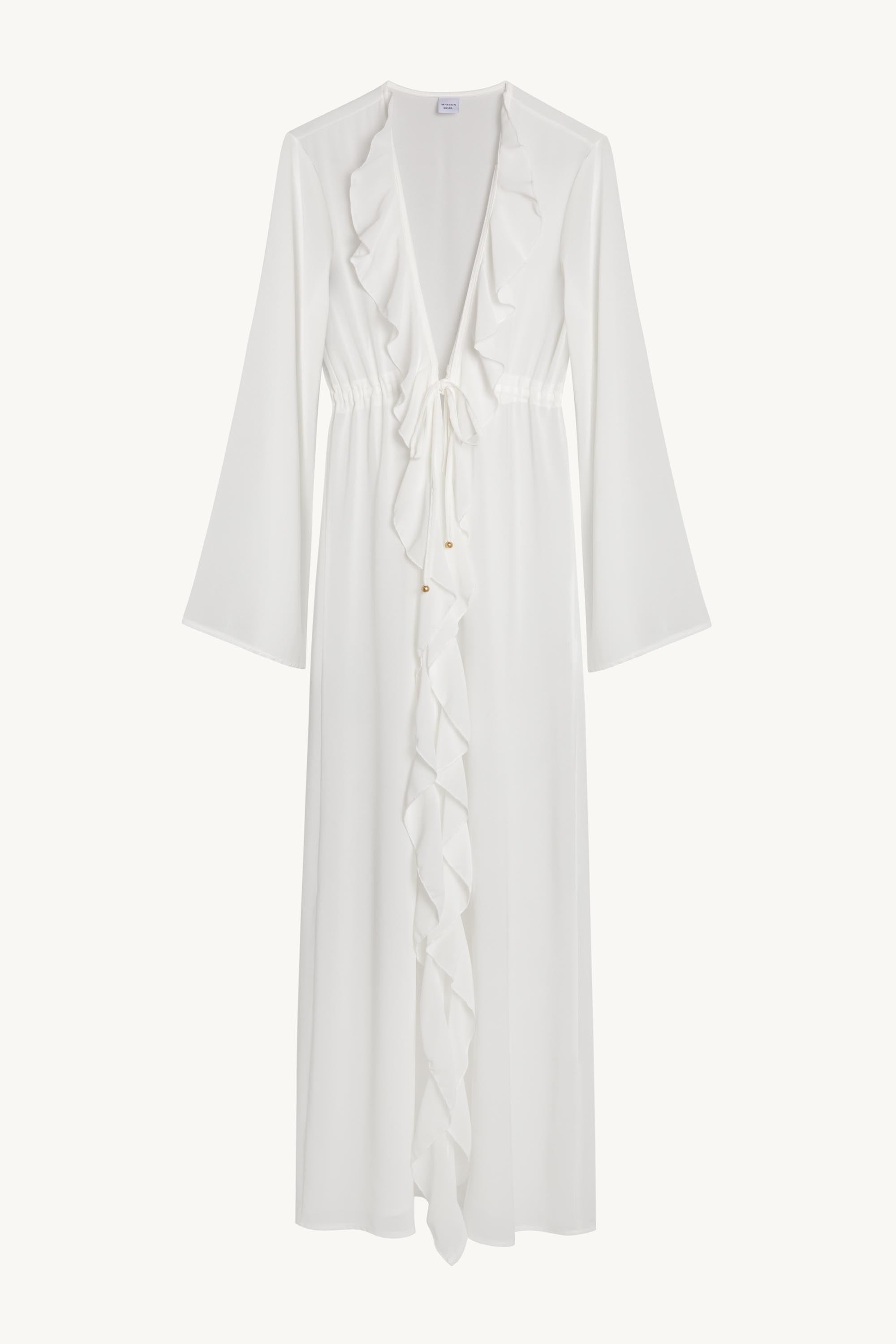 Realizzato in prezioso Chiffon Italiano, si distingue per la sua linea lunga e fluida, che sfiora il pavimento con eleganza.