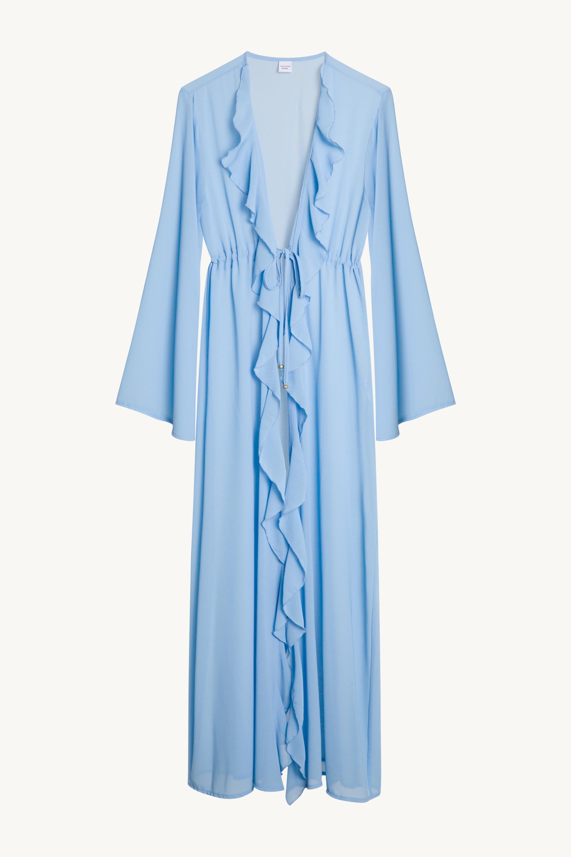 Realizzato in prezioso Chiffon Italiano, si distingue per la sua linea lunga e fluida, che sfiora il pavimento con eleganza.