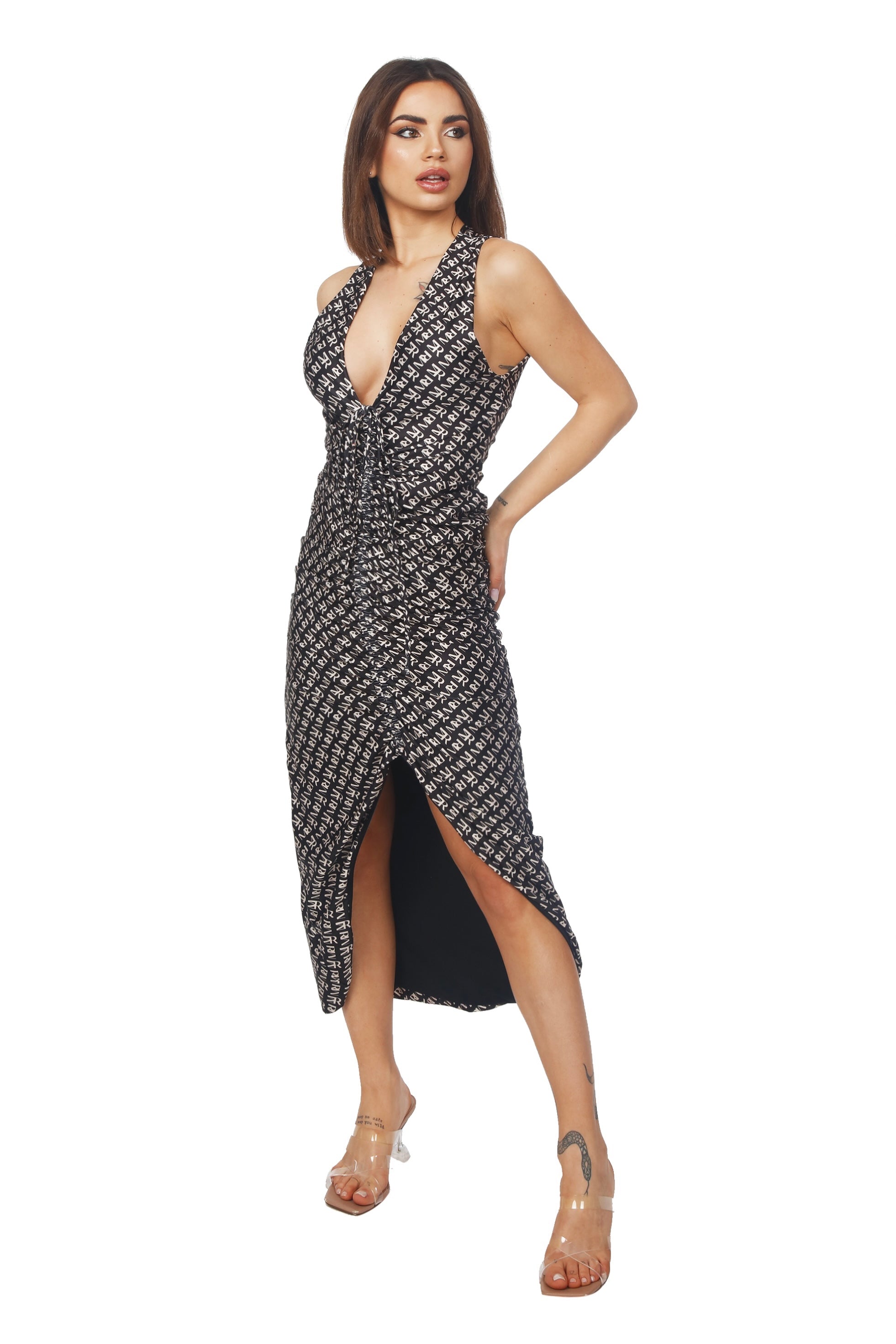 Zendaya long dress monogram by Maison Roèl è l'abito serale che non potrà mancare nel tuo armadio. La coulisse regolabile ti permetterà di accorciare o allungare lo spacco e la scollatura del tuo zendaya. Realizzato in morbidissima lycra 100% italiana  ed impreziosito dalla fantasia iconica della collezione con monogramma identificativo del brand stampato direttamente sul tessuto.